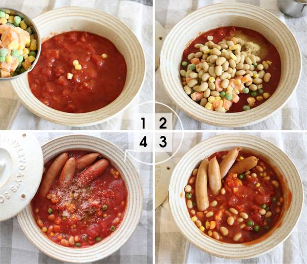 大豆の水煮、冷凍野菜ミックス、顆粒ブイヨン、塩コショウを加えます。