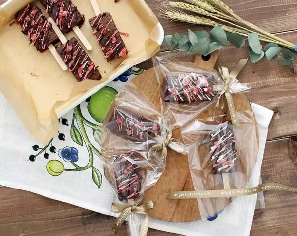 いつものブラウニーも、ウッドスティックを刺して可愛くデコレーションするだけで、バレンタインにぴったりのお配りスイーツになりますよ。