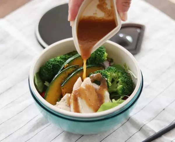 ドレッシングをたっぷりかけていただきます。保冷剤は入れられますが、オフィスで冷蔵庫保存ができる方におすすめのヘルシーランチです。