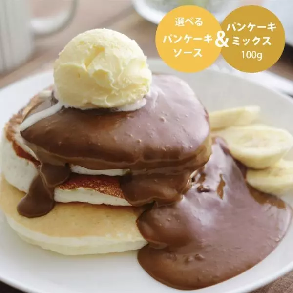 話題の「背徳グルメ」をおうちで!温めるだけのレトルトパウチ入りソースと、牛乳と混ぜて焼くだけのパンケーキミックスのセットで、休日もおうちで手軽にカフェ気分が味わえます。