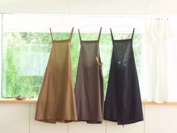 エプロンは家事をする時に着けるもの。朝昼晩の三食、掃除洗濯、後片づけ、家事は切れ目なくやってきます。それなのに、私はこれまでエプロンをあまり着けていませんでした。エプロンをつけること自体が面倒で、負担だったのです。私が使っていたのは、首と腰でそれぞれ紐を結んで着用するタイプ。細身のシルエットになりますが、長時間着けていると首や腰が締め付けられている感じがありました。コットンリネンシンプルエプロンはすっぽりと着るタイプなので、着脱がすぐ出来るうえに、首・肩・腰に負担がこない。