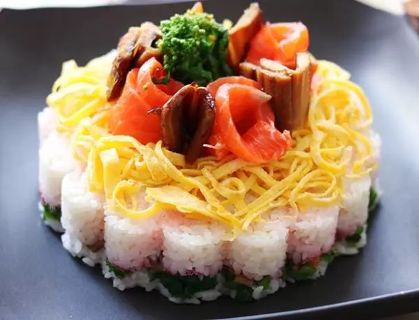 こちらは酢飯を菱餅風に色付けし、三層にアレンジ。