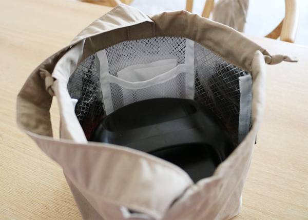 Mサイズはキャリーランチボウルもすっぽり。保冷機能付きな上、保冷剤をセットできるポケットがあります。
