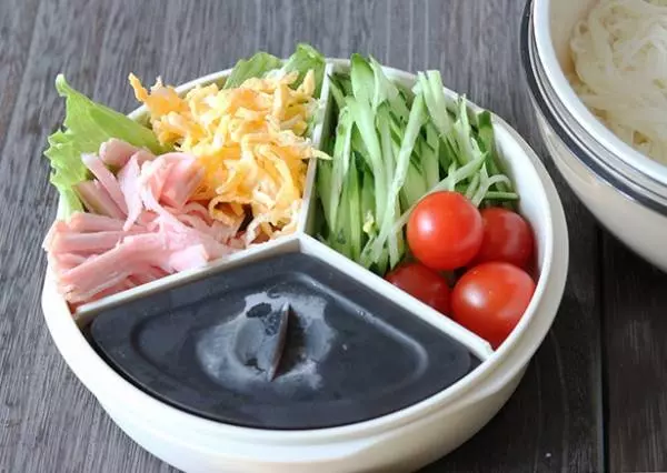 ▲夏の人気メニュー。そうめん弁当。付属の容器に素麺つゆを凍らせておけば、保冷効果も高くより安心。
