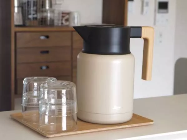 起きてすぐサーモジャグに飲み物を入れてコップと一緒にトレーに乗せておけば、「飲み物はご自由にどうぞ」システムの完成です。