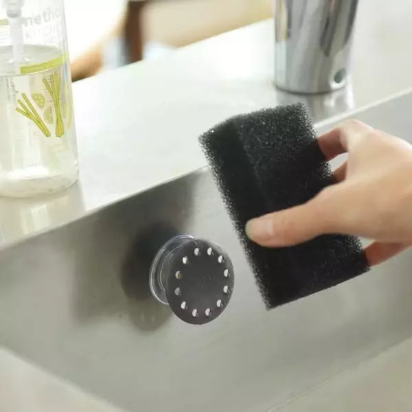 スポンジ収納の衛生面の悩みを解決してくれる、浮かせるスポンジホルダー。吸盤式のスポンジホルダーに、片手でポンッと置くだけ。スポンジが斜めになるので、水切れも◎。
