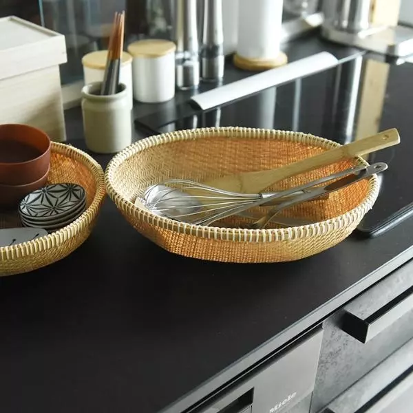 ナスやきゅうりなどの夏野菜を入れた姿も絵になる竹ザル。こちらは、ベトナム製の細やかな編み目模様で和テイスト過ぎない雰囲気も◎。またしっかり深さもあるので、収納カゴとしても優秀なんです。