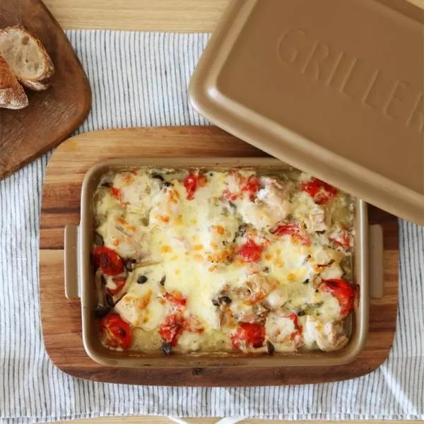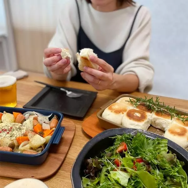 テーブルセッティングなどですぐ食べられない時も、蓋をして置いておけば少し時間がたってもあったか&ふわふわをキープしていました。グリラーパンと同時進行で作った根菜とカマンベールチーズのグリル、サラダで乾杯!