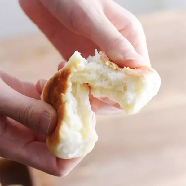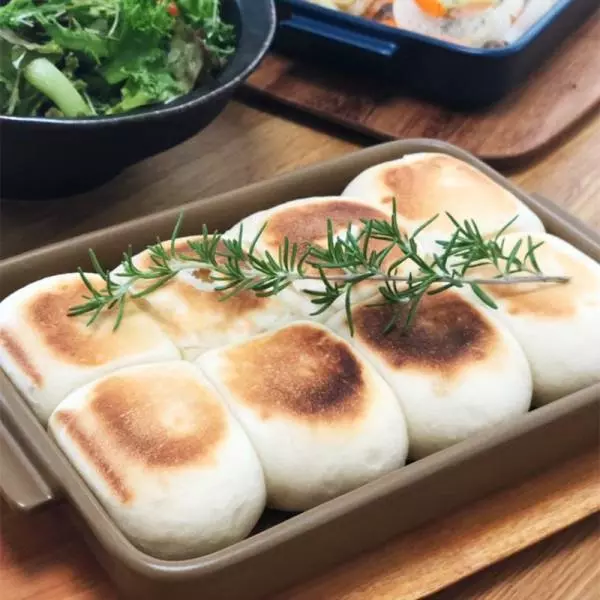 上下弱火で8分程焼いたら、この通り!きれいな焼き色の丸パンの出来上がりです。