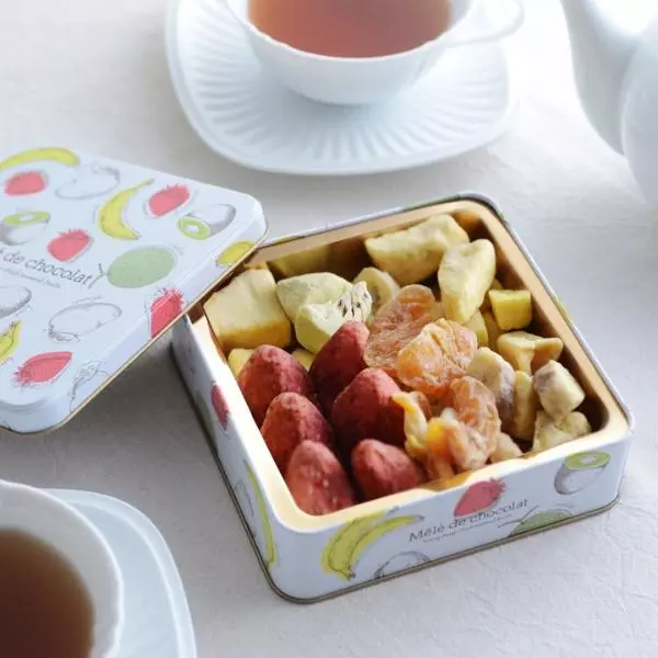 ドライフルーツにチョコレートを浸みこませたメレ・ド・ショコラのチョコレート。こちらは5種類のフルーツのしみチョコとドライみかんが缶にぎっしり詰まっています。