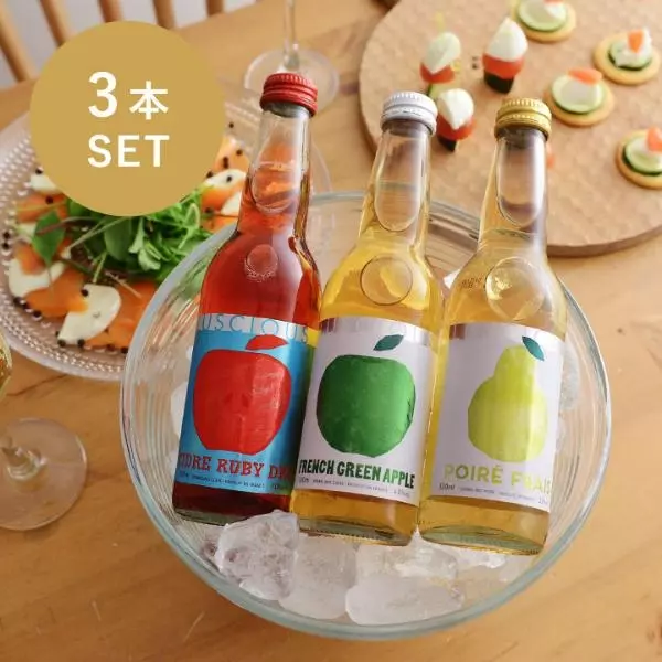 香料・砂糖・甘味料を添加せず、果実そのものの美味しさを楽しめるスパークリングワインとシードルの3種セット。色とりどり、食卓を華やかに演出してくれます。