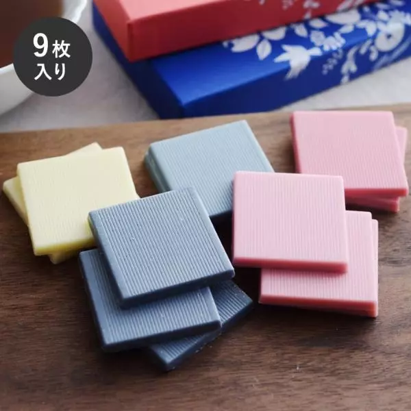 チョコレート色といえば、ブラウンやホワイトを思い浮かべますが、こちらのチョコレートは優しい青と赤!目でも楽しませてくれる新鮮なカラーリングが特徴のチョコレートです。