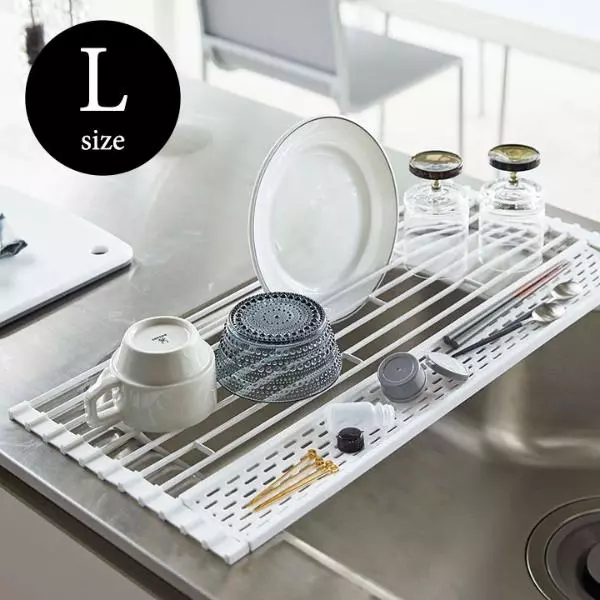 シンクに水切りスペースを増やせる、折りたたみ可能の水切り。鍋やフライパン、食器はもちろん、お箸などの小物も置けるトレイ付きです。