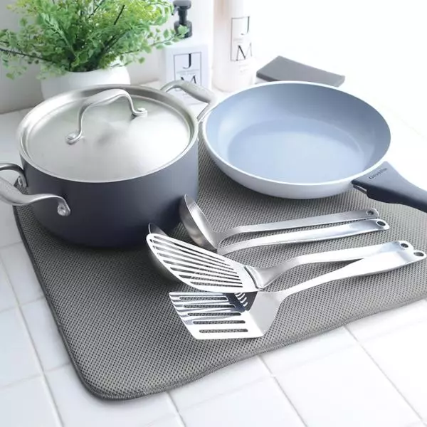 「ホントにすごくよく水を吸ってくれ、大きめの鍋や蓋なども早く片付けが出来る様になって、とても役立ってくれてます。」「水切りカゴに入らない大きい鍋やフライパンを置くのに使っています。吸水性が抜群で、キッチン台が濡れることはありません。」「ささっと洗濯するだけで良く、トレーのお手入れから解放されました。」