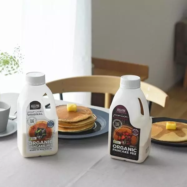 容器の口から牛乳または豆乳を注いでシェイクして、そのまま焼くだけでパンケーキを作ることができる、キアラピュアフーズ オーガニックパンケーキ 325g 。自然豊かなオーストラリア生まれの美味しさです。