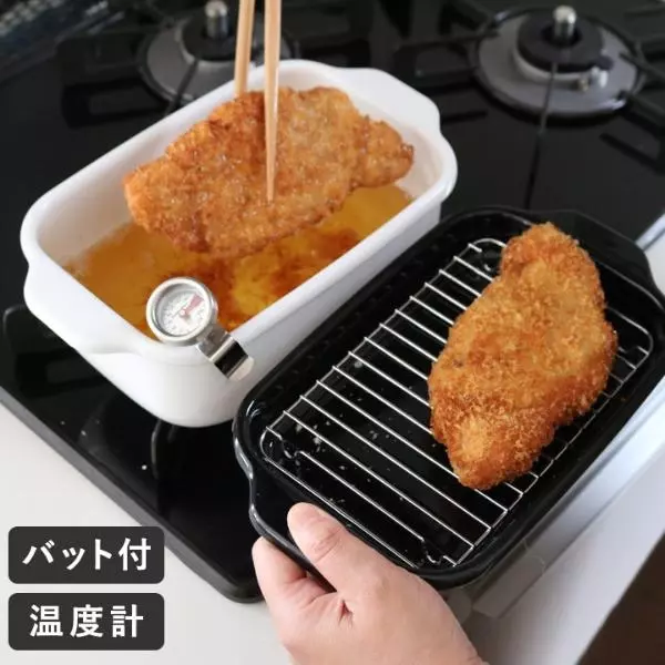 揚げ鍋のほかに、防水型の温度計・トレイ・すのこ網もセットに。トレイは衣をつけるバットにしたり、すのこ網をセットして油切りに使うこともできますよ。準備も片付けもぐっと手間が少なくなります。