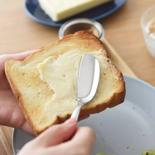 このナイフで、バターを使う分だけカットすることや、コッペパン、ベーグル、スコーンなど柔らかめのパンに切れ目を入れてそのまま塗り込むこともできるんです。