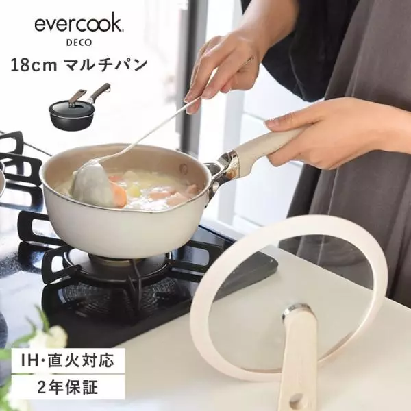 焦げつかないフライパンで人気のエバークックシリーズから最上位モデルが登場。深型の18cmマルチパンは、小回りが利きやすくどんな調理もこなせます。IHとガス火の両対応。