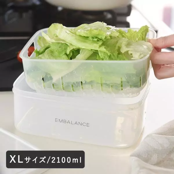 入れておくだけで食材の鮮度を保ってくれる、エンバランス レクタングルコンテナXLサイズ(ザル付き)。洗って繰り返し使え、経済的です。もったいない食品ロスを減らすのに一役買ってくれます。