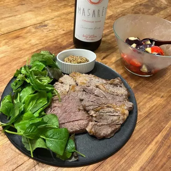 カットの際に出た脂を軽く拭き取り、お野菜を盛り付けたら直接食卓へ。