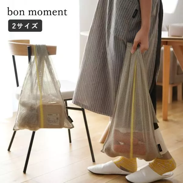bon moment(ボンモマン)のラッセル編みエコバッグは、風通しがよく、軽くて丈夫なことから、ベジタブルストッカーとしても便利なアイテム。