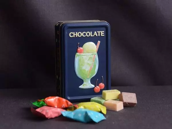 くちどけの良いチョコレートとパチパチはじけるキャンディーで、懐かしの喫茶店の炭酸メニューを再現。コーラフロート、サイダー、メロンクリームソーダ、いちごソーダ、レモネードの5味が2粒ずつ入ったアソート缶です。