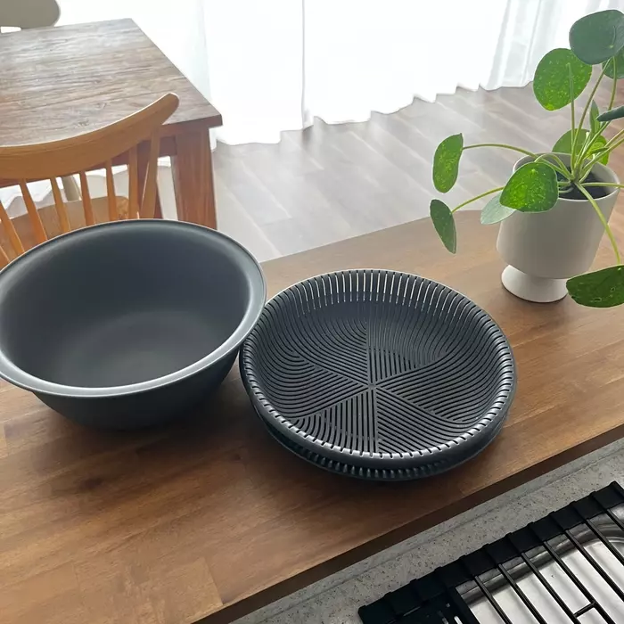 限られたスペースのキッチンでいかに効率よく、かつ快適に料理ができるかを求めて出合ったのがマーナの「トレー付きザルボウル」。