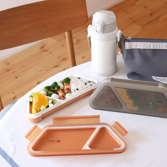 フタの4点ロックで、縦にしても漏れないほどの密閉力です。小さめのお弁当箱といえばコロンとした形のイメージですが、こちらはスッキリ薄型で、バッグの隙間に立てて入れることもできます。