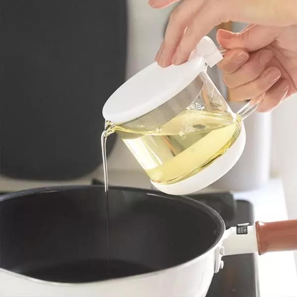 油の色や量を一目で確認できる、耐熱ガラス製のオイルポット。