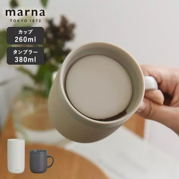 フタをしたまま、360°どこからでも飲み物が飲めるmarnaの保温保冷カップ(260ml)&タンブラー(380ml)。真空二重構造で飲み物の温度をキープしてくれます。