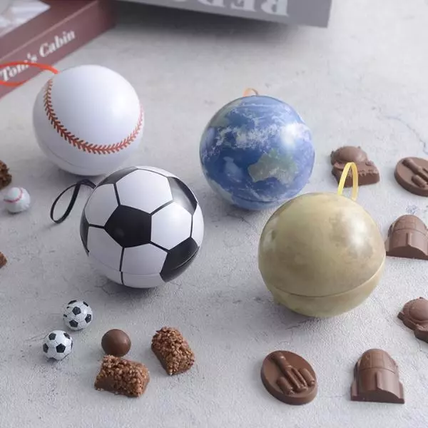 地球や月、野球ボールやサッカーボールをデザインした、まあるいオーナメント缶入りチョコレート。バレンタインやホワイトデーのギフトにもぴったりです。