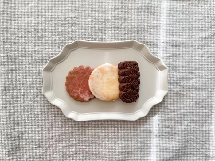 色とりどりのかわいらしいクッキーを、ディスプレイのように見せてくれるのは、bon momentの「インテリアとしても楽しめるプレート」です。
