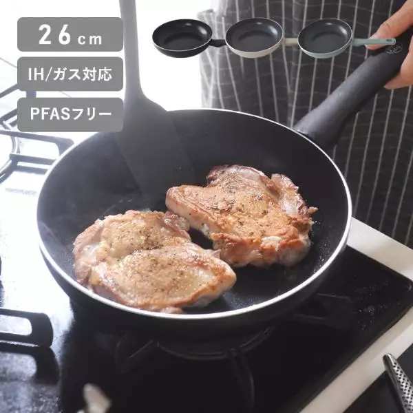 こちらは、3~4人分にちょうどいい26cmサイズです。餃子が12個くらい焼けます。特許取得のコーティングを施したPFASフリーのセラミックフライパン。世界初、フッ素樹脂を使用しないノンスティッククックウェアを開発したグリーンパンの一品です。
