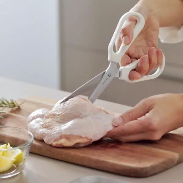 【ご紹介したアイテム】 お肉も野菜もハサミ一本で調理可能なマーナ「料理のハサミ」。包丁以上に料理しやすいキッチンバサミを目指して作られた一品です。