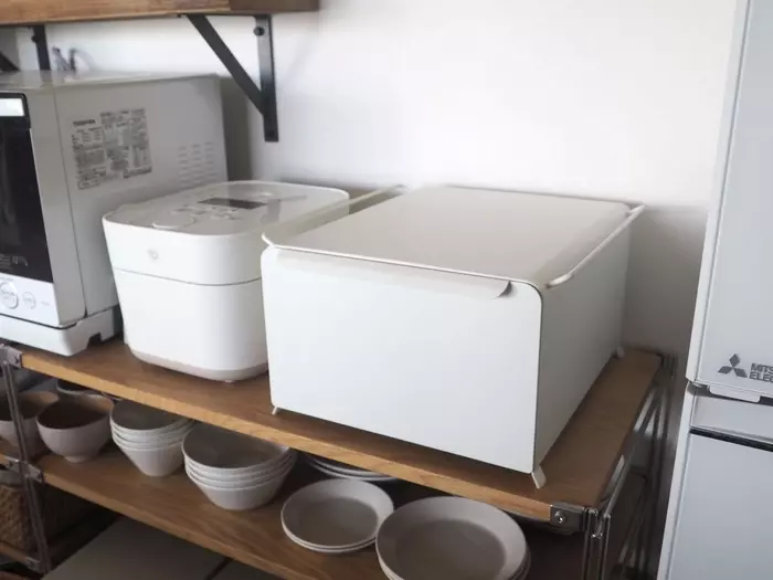 以前蓋付きのブレッドケースを使用していたのですが、蓋を開け閉めするのが手間になったり、上に物を乗せると出し入れがしにくく、いつの間にか使用しないように…。そんななか、Ordreの「コンパクトに置ける ブレッドケース」は、引き出し式。奥のものも取り出しやすく、天板には炊飯器やケトルを乗せることも可能なんです(天板の耐荷重は約5kg)。