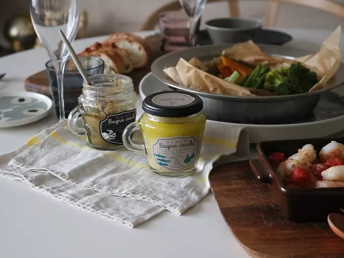 可愛らしい瓶に入った、このバーニャカウダソース。実はとても久しぶりの入荷なんです。お客様やスタッフから「またあれが食べたい」「あの味が忘れられない」の声が多くて、念願の再入荷となりました。しかも、人気のかにみそ味だけでなく、新たにアンチョビ味も加わり、選べる2つのフレーバーに増えての再販です。片方だけでも、両方を食卓に並べて食べ比べても◎です。