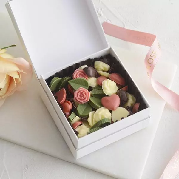 シーズンごとに彩りやモチーフが変わるショコラギフトボックス。ピンクや白のバラ、ハート型など華やかなチョコレートが詰められています。味はラズベリー・いちご・ホワイト・ダーク・抹茶の5種類です。