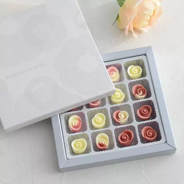 シーズンごとに彩りやモチーフが変わるギフトボックス。こちらは、ピンクやホワイトの薔薇のつぼみが並んだショコラボックスです。全16粒(5種類のフレーバー)入りです。
