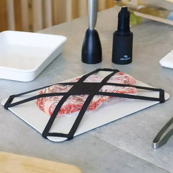 付属のバンドで食材をしっかりと密着させることでよりスピーディに解凍できる進化版解凍プレートです。素早く解凍できるだけでなく、ドリップを抑えてムラなく解凍することで、食材の美味しさを逃がしません。