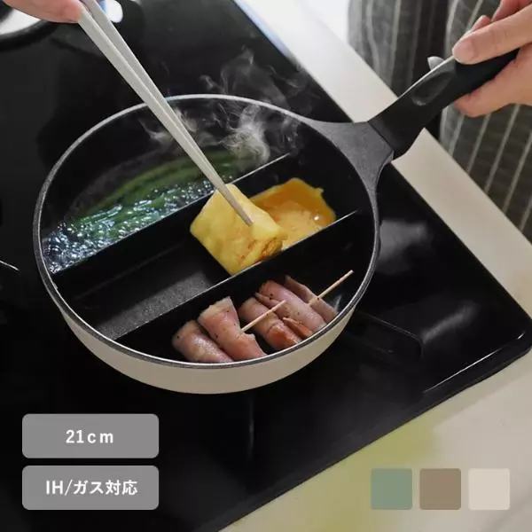仕切り付きで3品を同時に作れるフライパン。朝食をパパッと作りたい方、キッズのお弁当作りに励む方に。また、卵一つでふっくら玉子焼きが完成するのも嬉しいポイントです。
