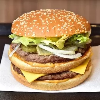 BIG KINGは直径約13cmのハンバーガー。バンズが3層あり、上の層には直火焼きビーフパティ1枚とレタス、スライスオニオン、ピクルス、オリジナルの「BK KING ソース」、下の層には直火焼きビーフパティとチェダーチーズをサンドしている。