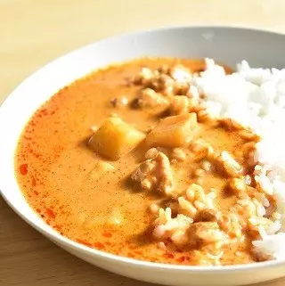 レトルトカレーのPBには、エスニックカレーの代表「バターチキンカレー」(税別150円)や「グリーンカレー」(税別150円)など全8種類がそろう。その中で一番人気なのが、「カシューナッツ香るマッサマンカレー」(税別150円)だ。ココナッツミルクとカシューナッツをベースに煮込んだカレーで、マイルドな口当たりが特長となっている。