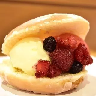 サンドするドーナツには、グレーズでコーティングされた「オリジナル・グレーズド」を使用。間には、果汁と果肉を44%配合したラズベリージェラートとリッチなバニラアイスをサンドし、フローズンベリーをトッピングしている。お店では7秒ほど温めてから提供されるのだが、この一手間を加えることで、「オリジナル・グレーズド」の生地にアイスがよく染み風味が増す。テイクアウト可能だが、長時間の保存は難しいとのこと。