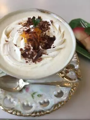 そうかと思えば、あちこちに猫のアイテムが置かれていたり、壁に獅子が飾られていたりと、ちょっとカオスな感じも面白い。こちらで有名なのは高々と盛り上げられたパフェで、よく地元メディアに取り上げられていますが、フレンチトーストが絶品という評判も。飲み物のバリエーションは豊富で、下の写真はコーヒーの上にホイップとチョコチップ、さらにオレンジピールがトッピングされた洒落た一杯。