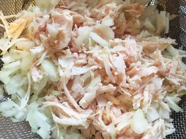3.細かく刻んだ玉ねぎと和えて、マヨネーズ、塩、こしょうで味付け。