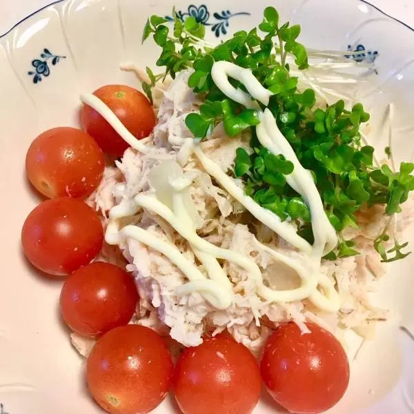 5.トマトやスプラウトなどと一緒に盛り付けて完成。
