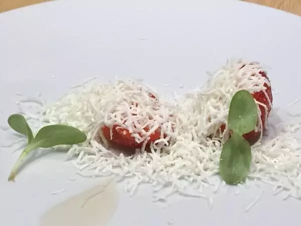 2.苺を適当な大きさにカットし、ドレッシングをかけます。