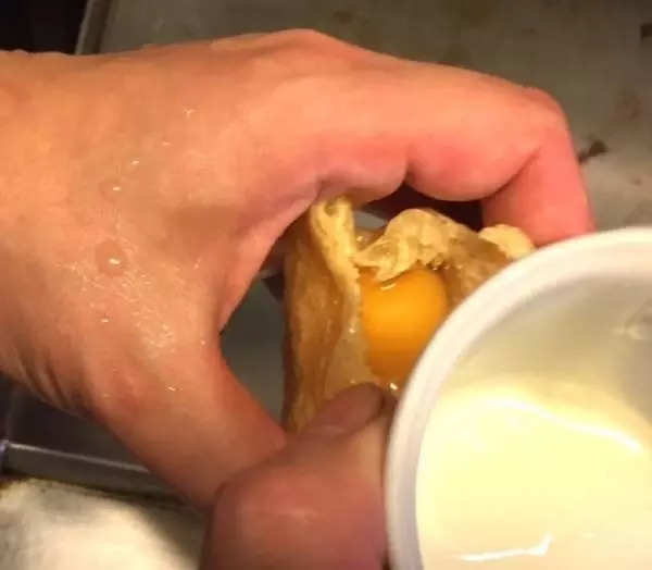 まずは、巾着卵をつくります。①薄あげを半分にカットして、中に卵を入れます。