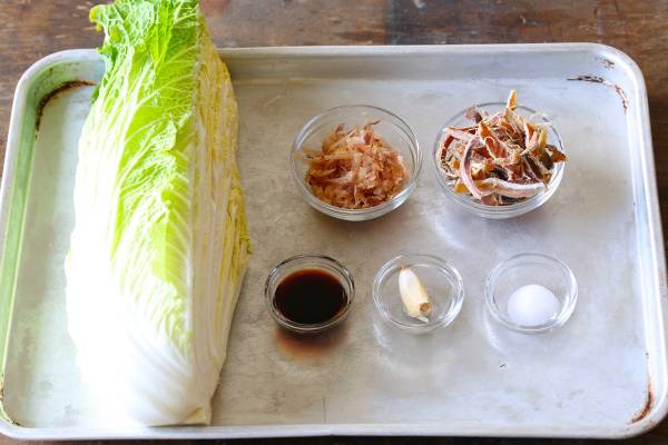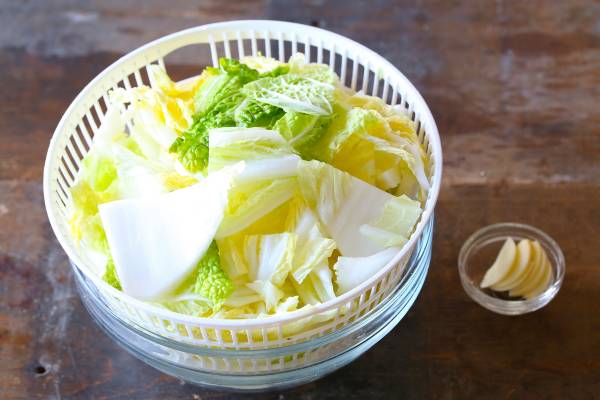 1、白菜はよく洗い、ざく切りにする。にんにくは薄切りにする。