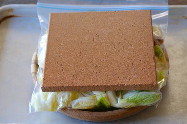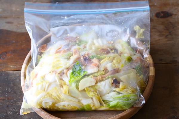 2、水気をしっかり切った1に塩を揉み込み、にんにく、するめ、醤油と一緒にジップロックに入れる。